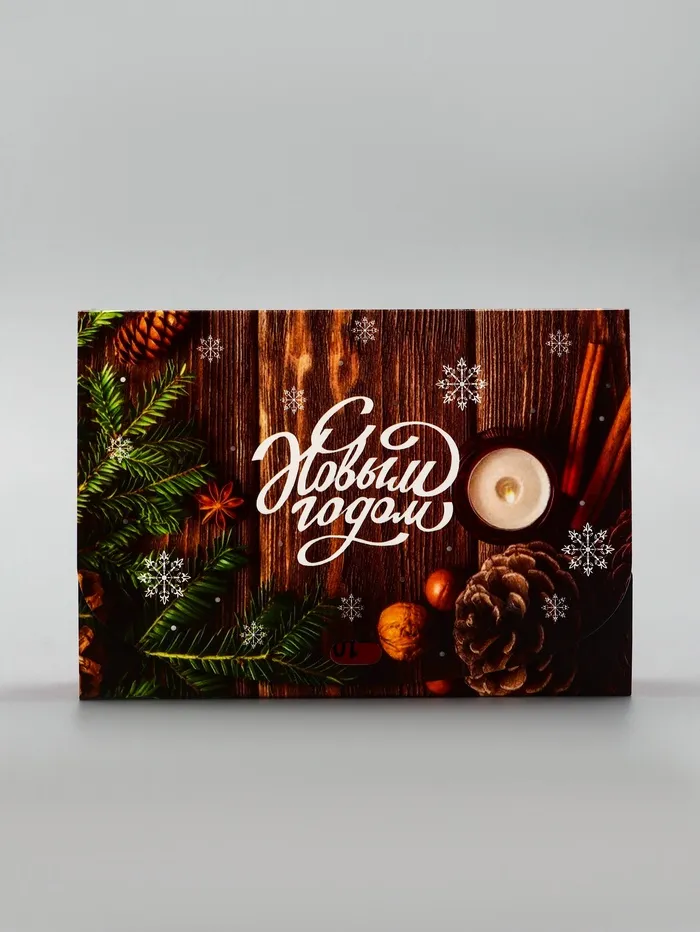 Идеи для наполнения: Эта коробка — отличный выбор для презента коллегам или друзьям. В неё можно положить набор бокалов с бутылочкой коньяка, дополнив шоколадными трюфелями. Или упаковать дорогую ручку с блокнотом в том же стиле. Добавьте веточку можжевельника — и подарок заиграет новогодним настроением!