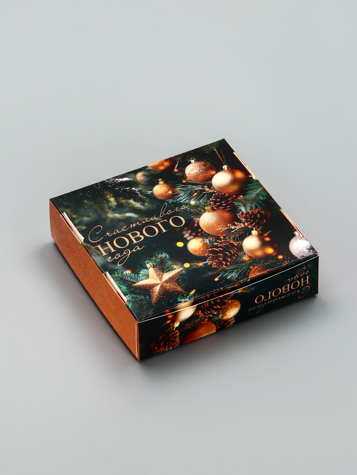 Для кого подойдёт: «Новогодний аромат» — выбор для тех, кто ценит детали. В такую коробку можно упаковать подарочный сертификат, положив под него веточку ели для аромата. Или собрать мини-набор: свеча + шоколадка + записка с пожеланиями. Универсальный размер делает коробку практичным вариантом для корпоративных подарков коллегам или памятных сувениров гостям праздника.