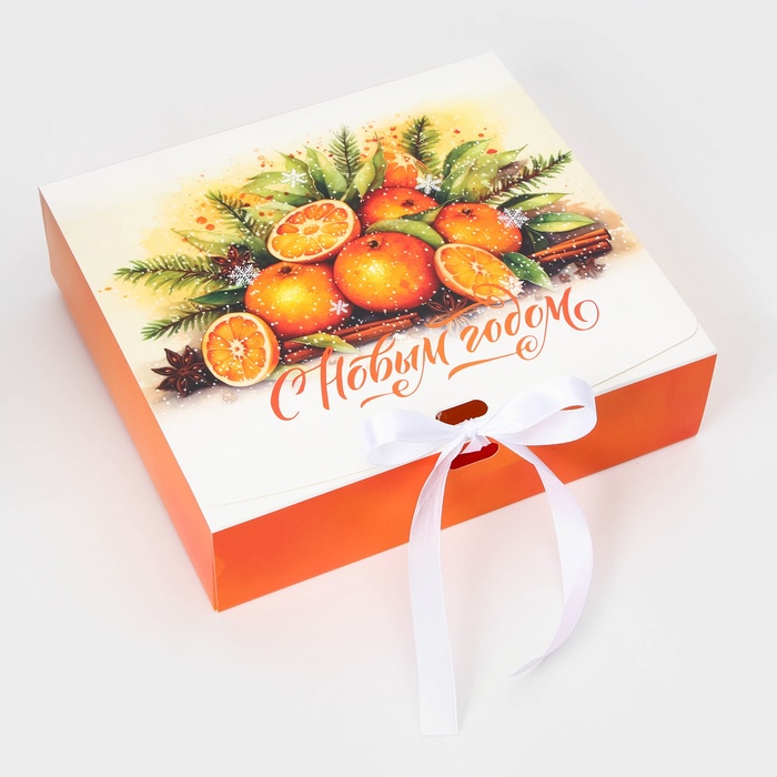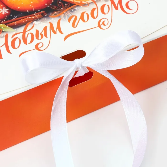 Изготовленная из прочного картона, коробка обеспечивает надежную защиту содержимого и легко складывается, что упрощает хранение и транспортировку. Яркий новогодний дизайн с праздничными элементами создает атмосферу волшебства и радости, а мягкая лента на крышке добавляет дополнительный элемент изысканности и завершенности.