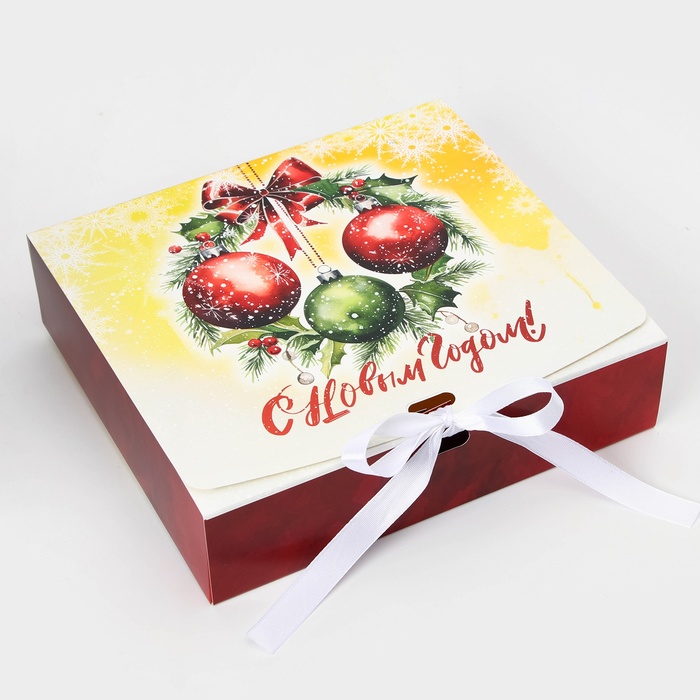 Складная подарочная коробка новогодняя с лентой, размером 20 × 18 × 5 см — это стильное и удобное решение для упаковки ваших праздничных подарков. Эта элегантная коробка с новогодним дизайном станет идеальным выбором для демонстрации ваших подарков в самые важные моменты.