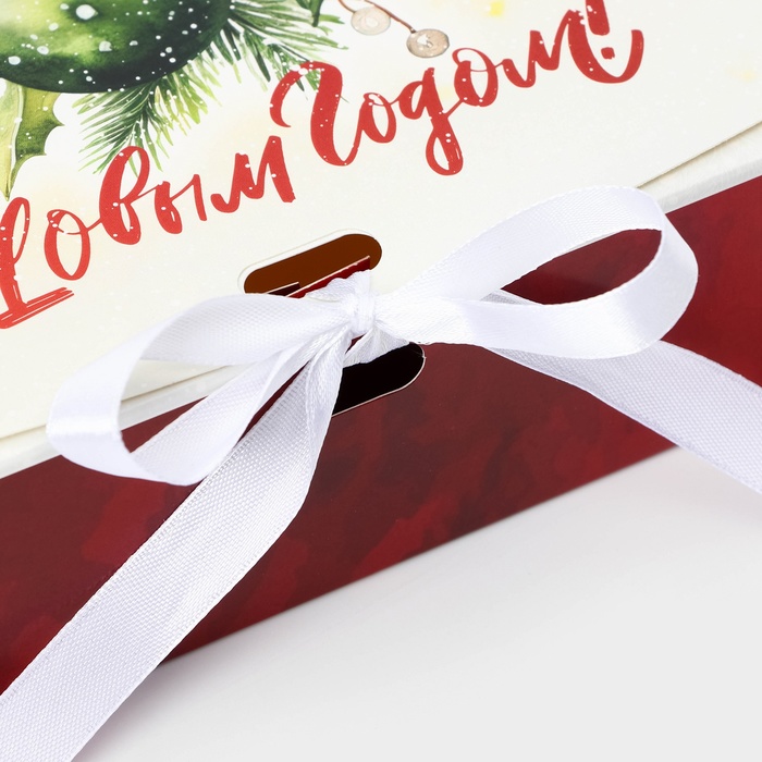 Изготовленная из прочного картона, коробка обеспечивает надежную защиту содержимого и легко складывается, что упрощает хранение и транспортировку. Яркий новогодний дизайн с праздничными элементами создает атмосферу волшебства и радости, а мягкая лента на крышке добавляет дополнительный элемент изысканности и завершенности.