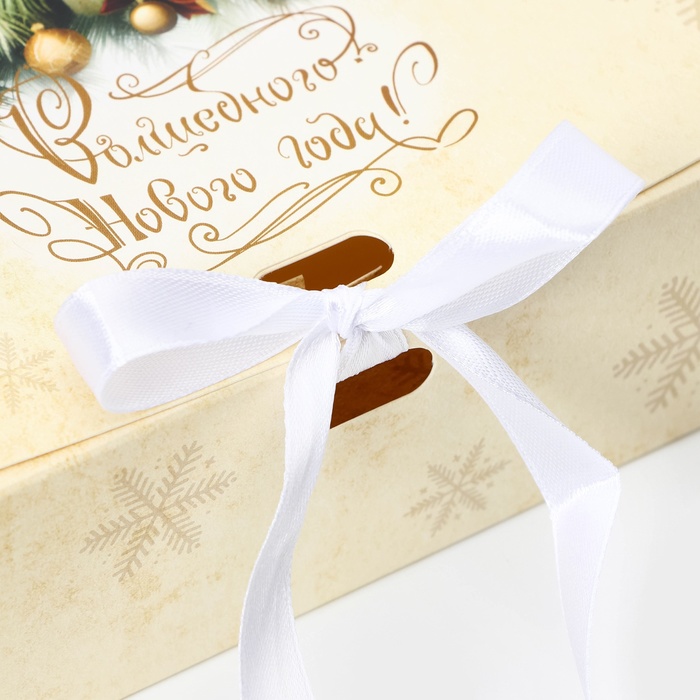 Изготовленная из прочного картона, коробка обеспечивает надежную защиту содержимого и легко складывается, что упрощает хранение и транспортировку. Яркий новогодний дизайн с праздничными элементами создает атмосферу волшебства и радости, а мягкая лента на крышке добавляет дополнительный элемент изысканности и завершенности.