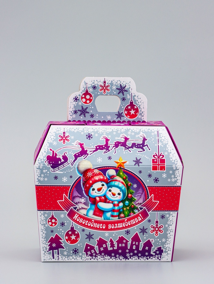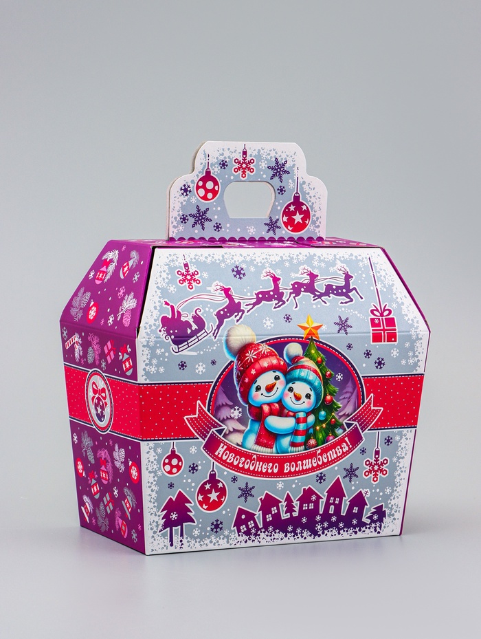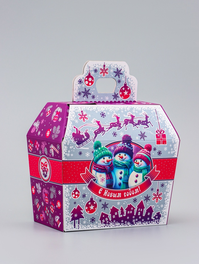 Создайте настроение зимней сказки! Коробка «Три снеговика» — это фигурная упаковка для новогодних подарков в виде нарядного сундучка. Серебристо-сиреневая гамма с изображением весёлых снеговиков создаёт лёгкое праздничное настроение.