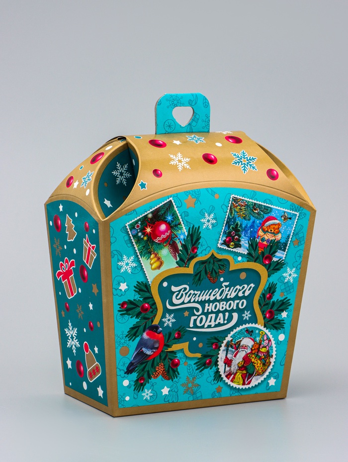 Создайте атмосферу новогоднего волшебства! Коробка «Волшебство» — это фигурная упаковка для праздничных подарков в виде изящного сундучка. Сочетание бирюзового фона с золотистыми узорами создаёт ощущение зимней сказки и праздничного чуда.