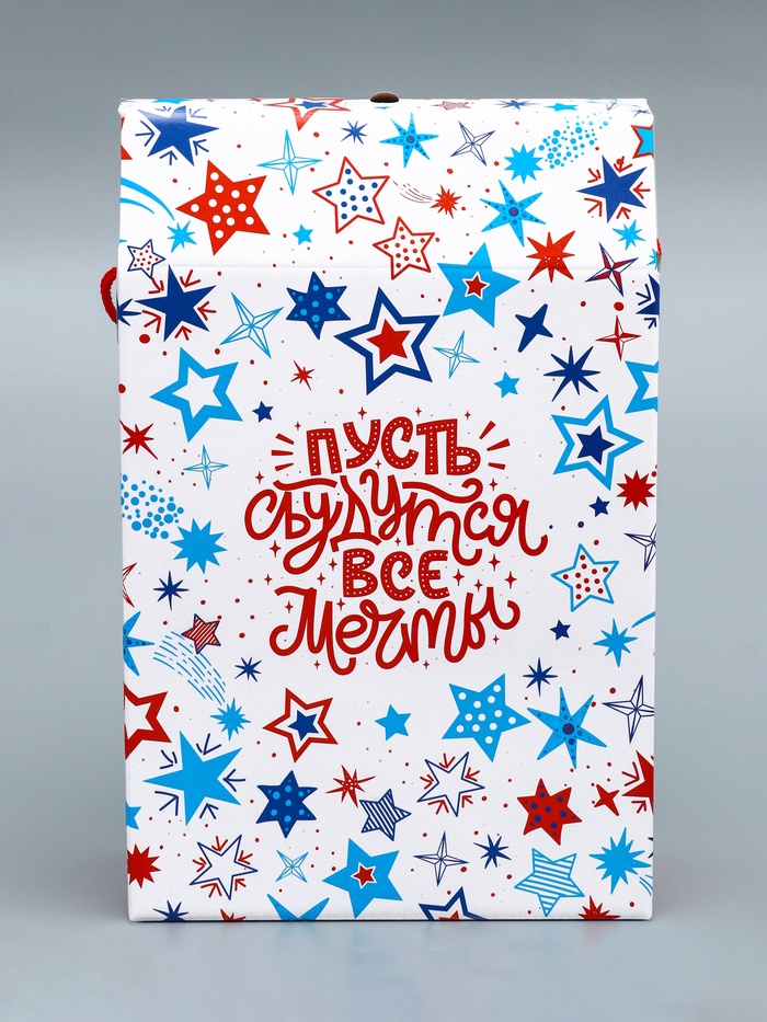 - Прочная конструкция: Плотный картон держит форму, не мнётся при транспортировке. Фигурная форма с откидной крышкой упрощает упаковку подарка.