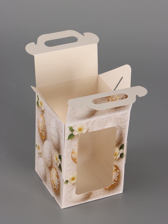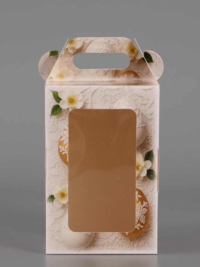 Уютная классика для пасхального подарка. Пасхальная коробочка с ручкой и окошком — это универсальная и стильная упаковка в нейтральной гамме. Ее теплый бежевый фон с растительным орнаментом подходит для любого пасхального сюрприза.