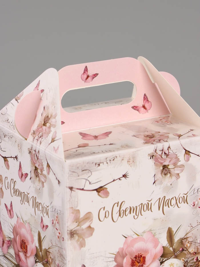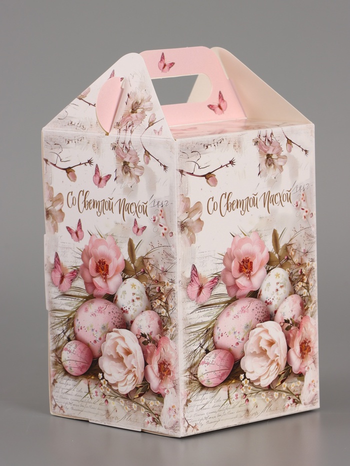 Лёгкое и радостное поздравление. Пасхальная коробочка с ручкой «Пасха» — это яркая и воздушная упаковка для небольшого праздничного сюрприза. Ее дизайн с бабочками, цветами и поздравительными надписями создает ощущение весенней легкости и обновления.