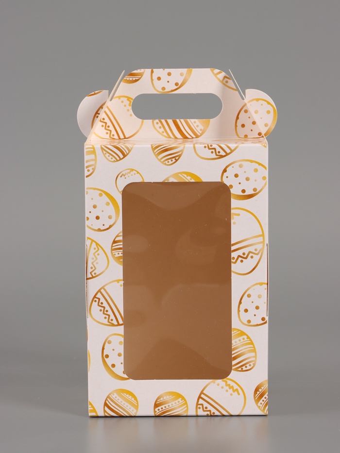 - Прозрачное окошко и нарядный дизайн: Окошко позволяет увидеть содержимое, добавляя интриги. Золотой орнамент на бежевом фоне выглядит празднично и благородно, отражая светлую и торжественную атмосферу Пасхи.