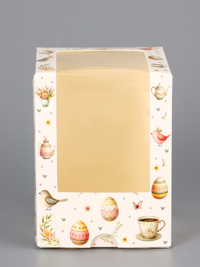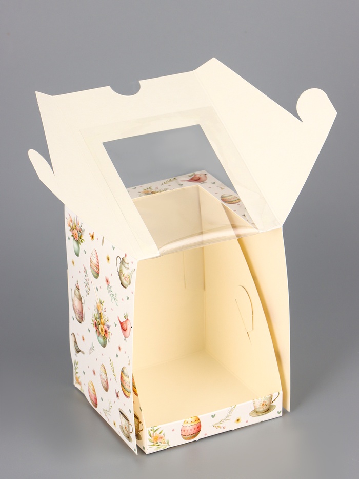- Окно для демонстрации милого сюрприза: Прозрачная вставка позволяет показать содержимое, делая акцент на самом подарке. Это может быть пасхальное яйцо, маленький кулич, праздничный пряник или чайный набор.