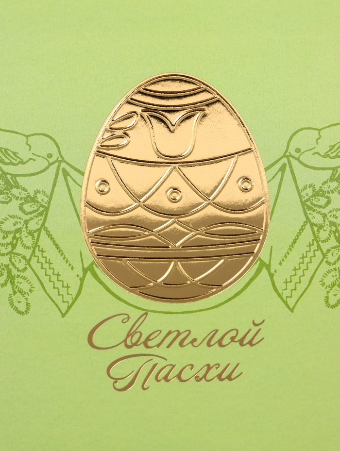 - Роскошный дизайн с золотым тиснением: Узор с пасхальной символикой и надписями, выполненный золотой фольгой на глубоком зелёном фоне, создаёт впечатление драгоценного ларца. Такое оформление говорит о важности подарка и внимании к деталям.