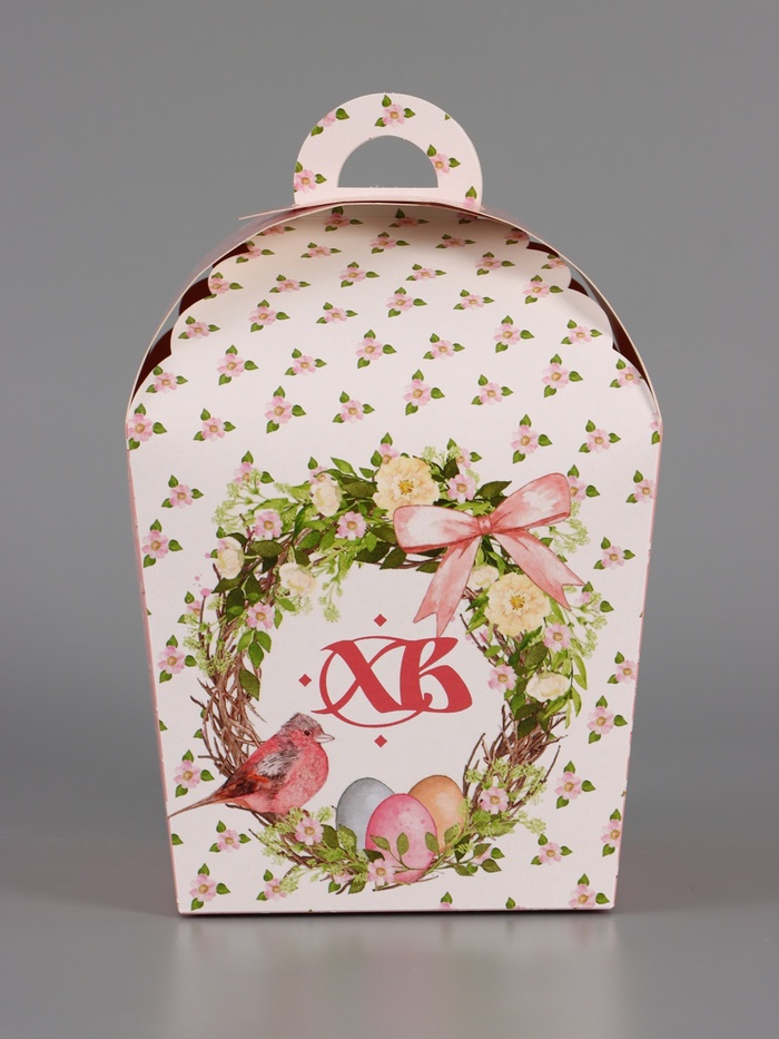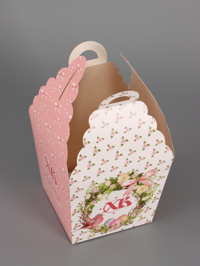 - Яркий тематический дизайн: Розовый фон с пышными цветами, пасхальными надписями и символами праздника создает радостное и торжественное настроение. Коробка сразу говорит о поводе.