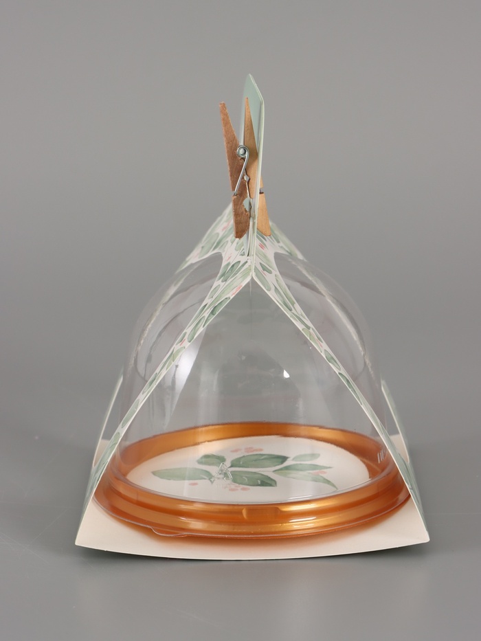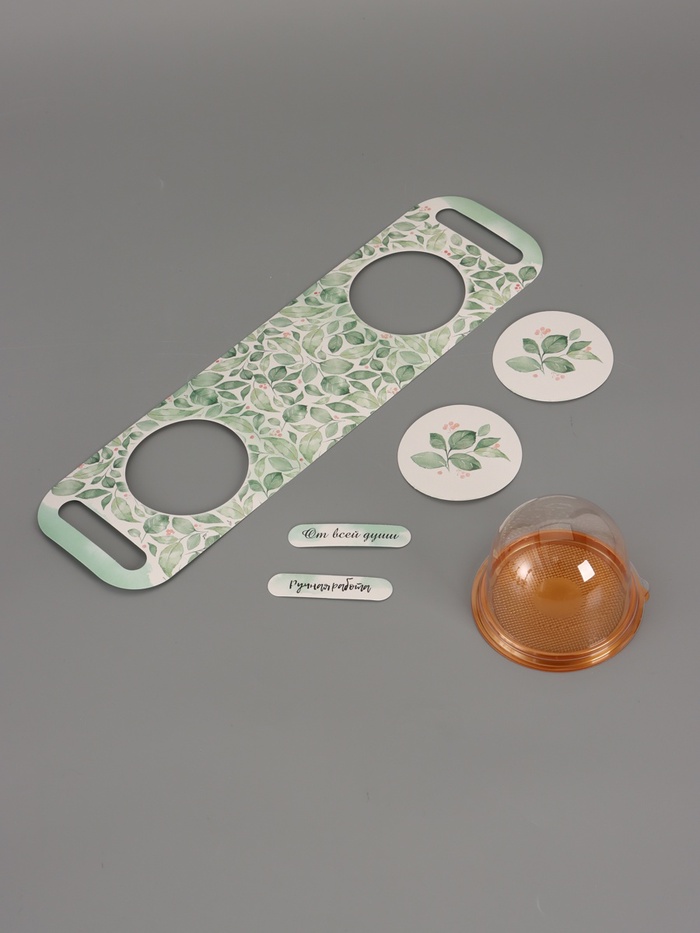 - Фигурная форма с прозрачным верхом: Конусообразный прозрачный купол (из ПВХ или аналогичного материала) полностью открывает вид на подарок, как витрина. Зеленое картонное основание с растительным принтом служит устойчивой подставкой.
