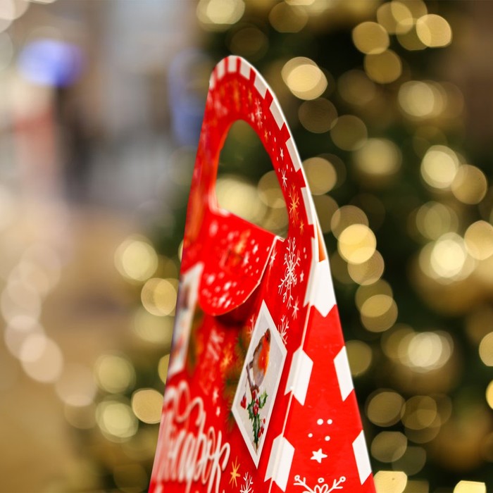 - Элегантный дизайн: Коробка необычной формы выполнена в глубоком красном цвете с новогодними и рождественскими узорами. Она добавляет изысканности и создает особое праздничное настроение.