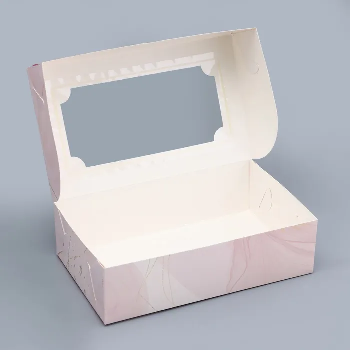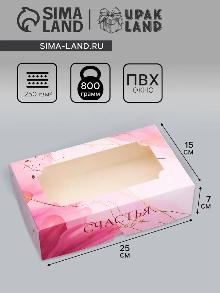 - Размер коробки составляет 25х15х7 см, что позволяет разместить внутри разнообразные кондитерские изделия: от небольших шоколадок до крупных конфет и даже пирожных.