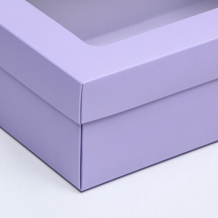 - Эффектная презентация: Прозрачное окно создает интригу и позволяет рассмотреть подарок до открытия. Сиреневый цвет служит гармоничным фоном для светлых десертов и пастельных аксессуаров.