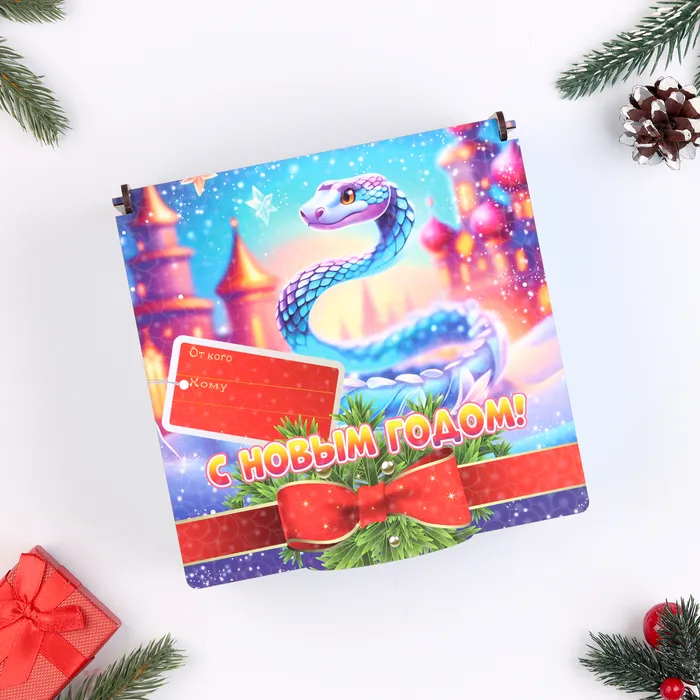 Преимущества коробки:- Яркий дизайн. Коробка оформлена в праздничной гамме с изображением Змеи – символа 2025 года. Принт выполнен качественно и привлечет внимание.