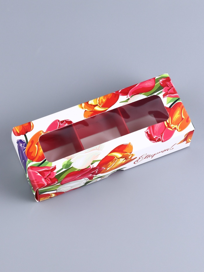 Особенностью этой коробки является наличие прозрачного окна, через которое можно увидеть содержимое, что добавляет интригу и предвкушение сюрприза. Дизайн коробки посвящен Международному женскому дню, с соответствующей символикой и надписью "8 марта".