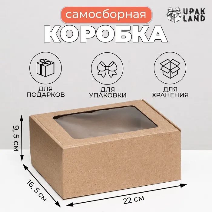 Коробка самосборная, бурая с окном, 22×16.5×9.5 см — Характеристики