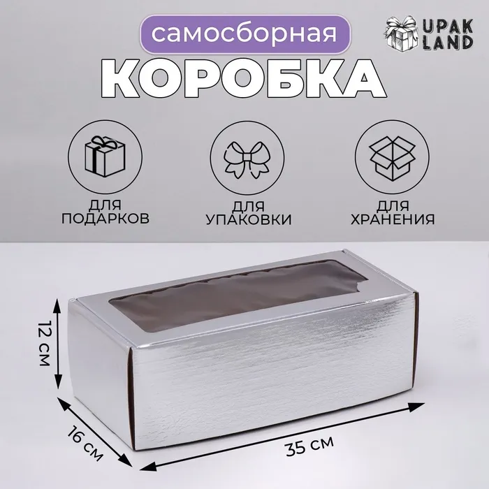 Коробка самосборная, с окном, серебряная, 16×35×12 см — Характеристики
