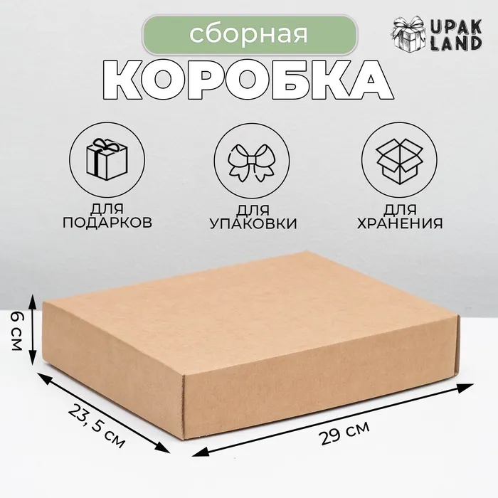 Коробка универсальная самосборная подарочная. Изготовлена из картона премиум-класса. Подходит как для подарка близкому на день рождения, так и для отправки посылки почтой как индивидуальная упаковка или для групповой упаковки товаров.