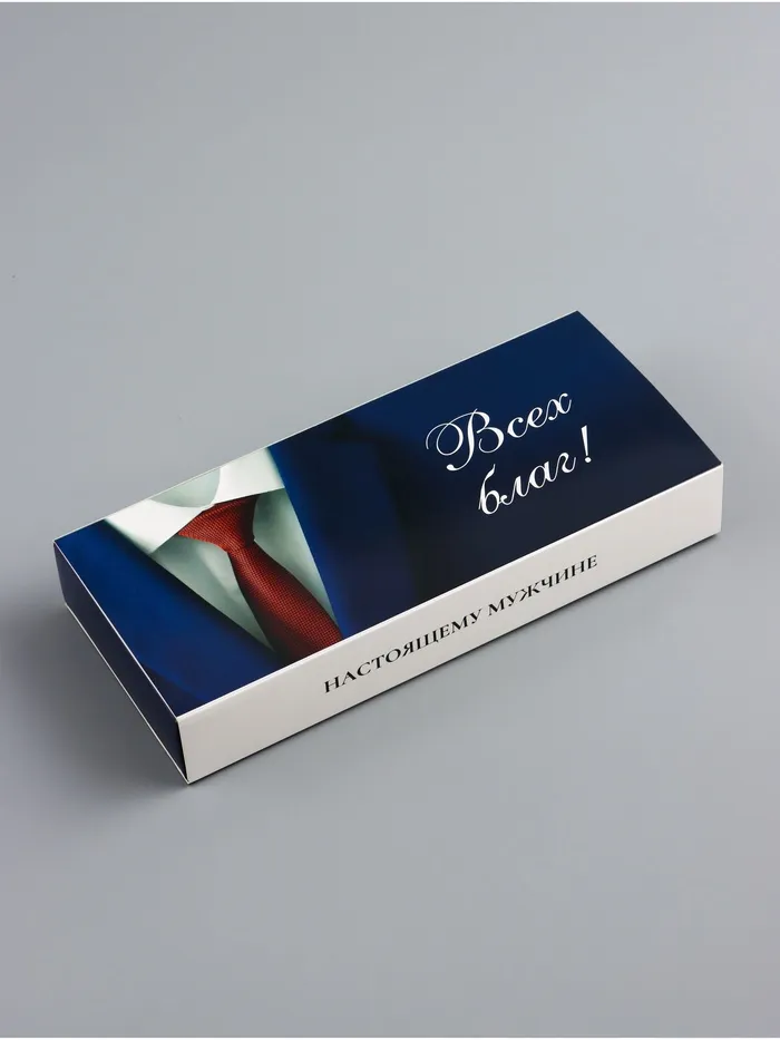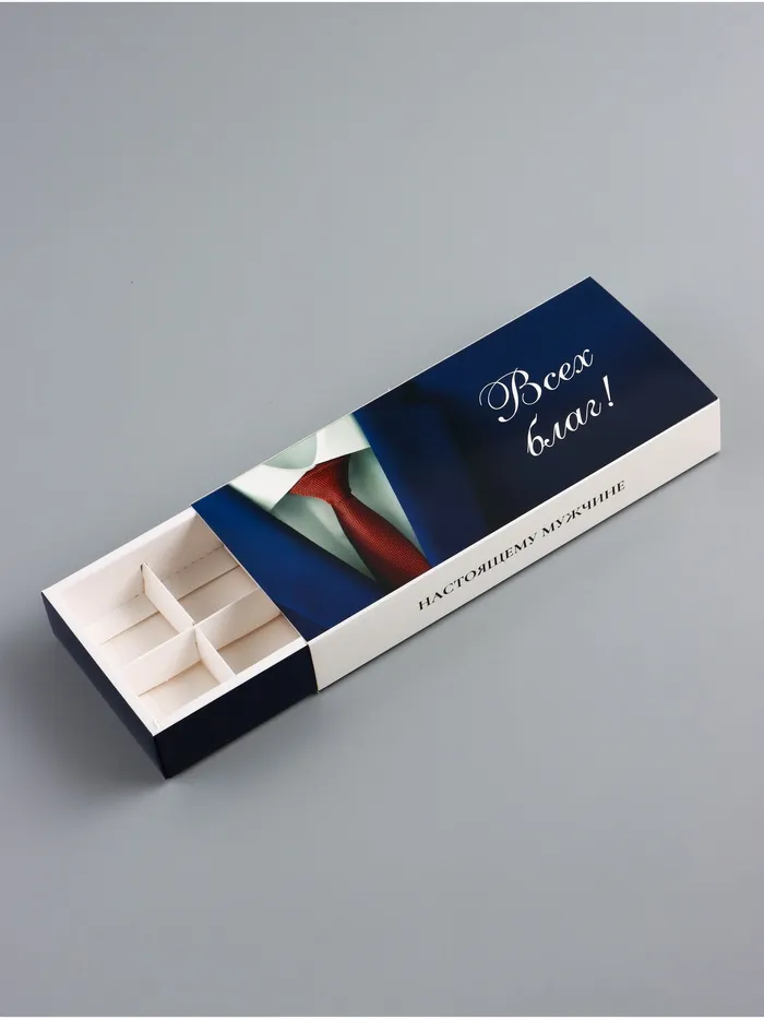 Складная коробка для конфет — это стильное решение для упаковки сладостей, которое станет идеальным подарком для настоящего мужчины. Её лаконичный дизайн в бело-синих тонах с тематическими надписями подчеркивает мужественность и создаёт праздничное настроение. Коробка рассчитана на 10 конфет, делая подарок аккуратным и запоминающимся.