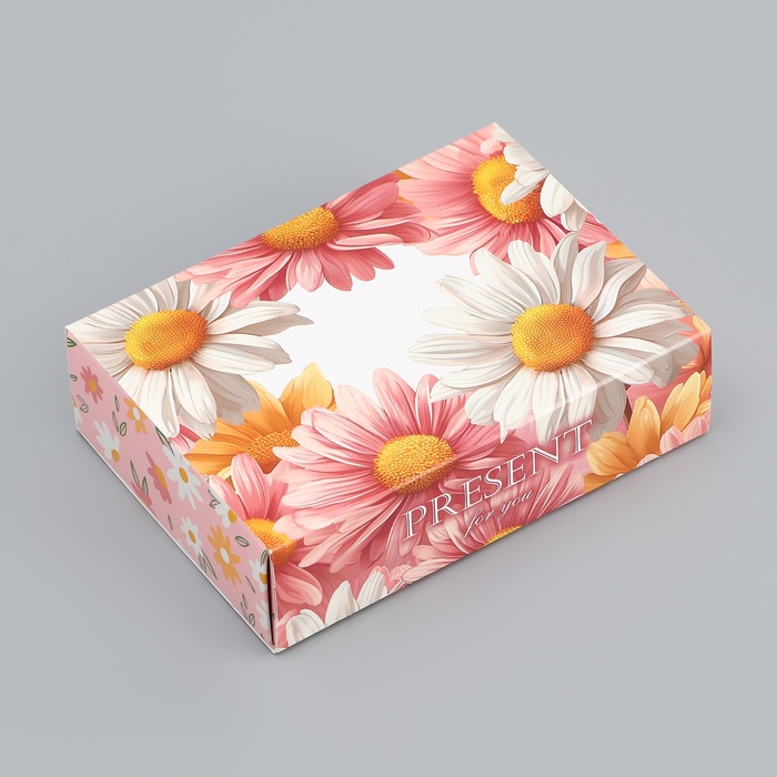 Коробка оформлена в пастельных тонах с нежным цветочным узором, отражающим весеннюю свежесть и романтическое настроение. Ее легко открыть и приятно держать в руках, что делает каждое распаковку настоящим событием.