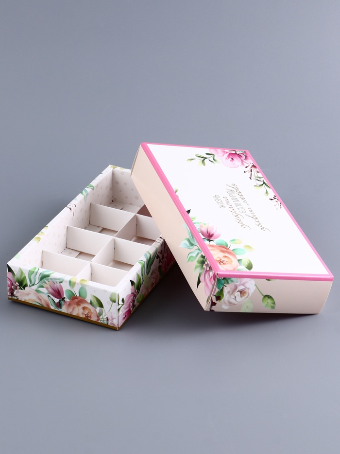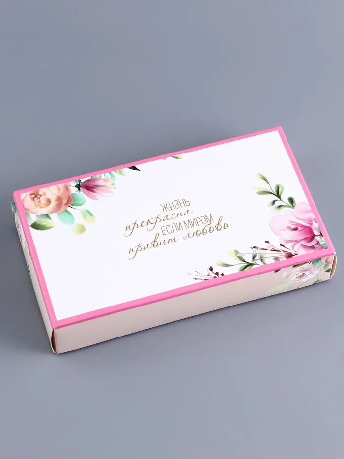 Элегантный дизайн с нежными цветами и пастельными оттенками добавляет коробке очарования и легкости, делая её подходящей для любых праздников, связанных с любовью и дружбой. Нежные тона создают атмосферу уюта и теплоты, подчеркивая заботу и внимание к каждой детали.