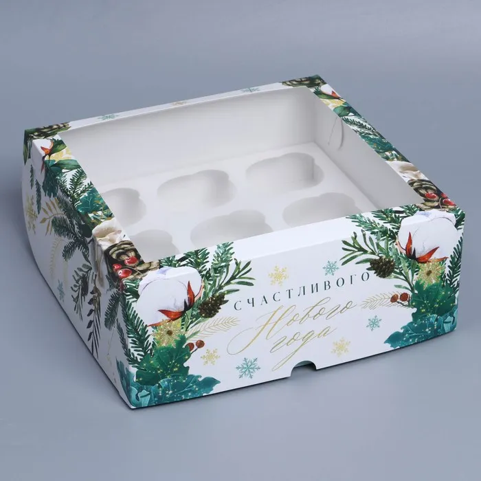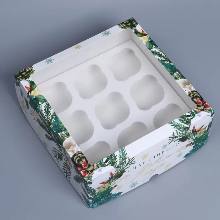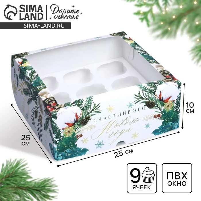 Коробка складная на 9 капкейков с окном «Счастливого Нового года», 25 х 25 х 10 см — Характеристики