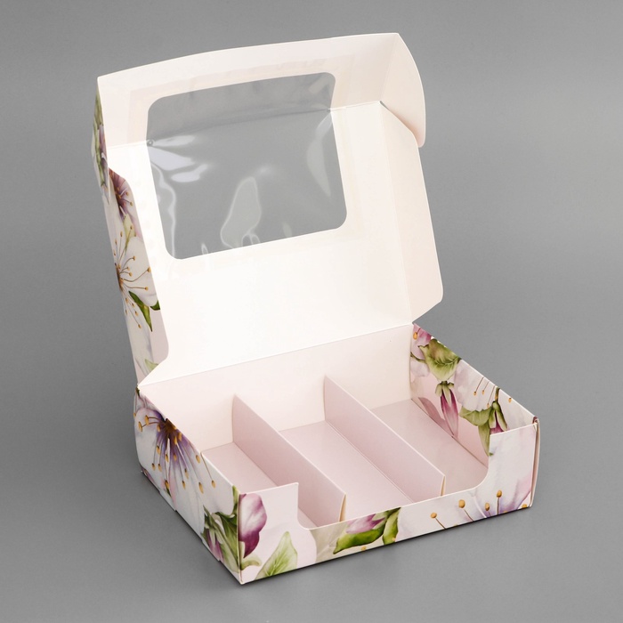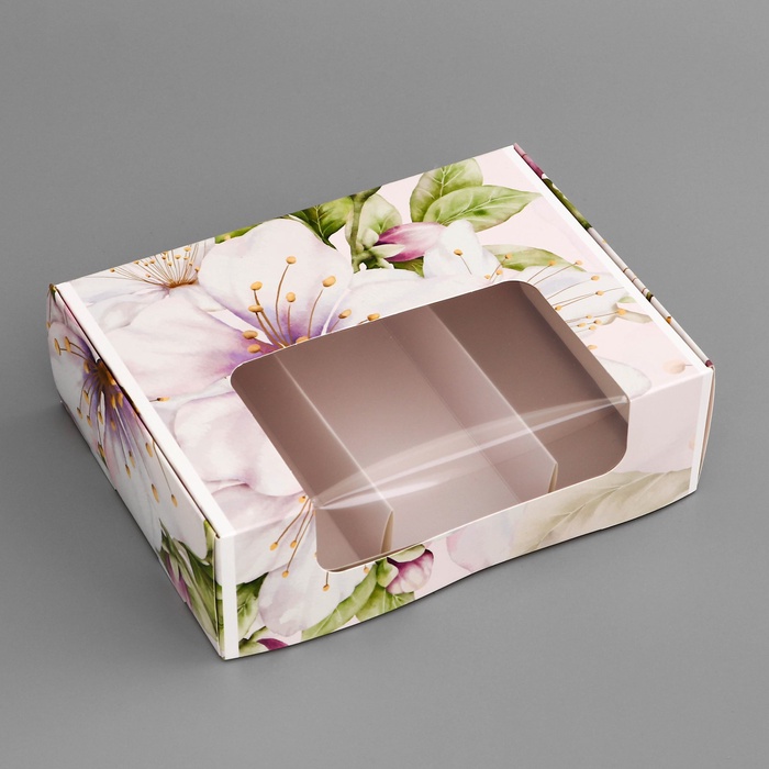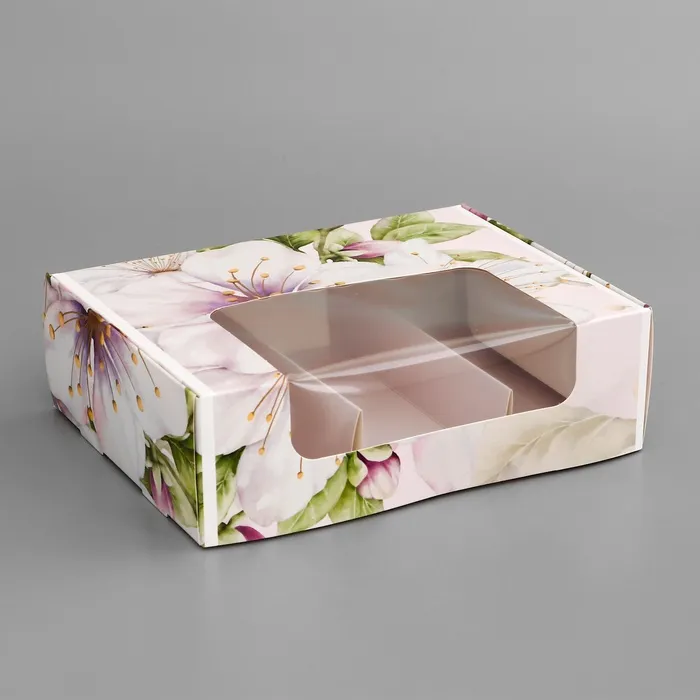 Коробка оформлена в пастельных тонах с нежным цветочным узором, отражающим весеннюю свежесть и романтическое настроение. Ее легко открыть и приятно держать в руках, что делает каждое распаковку настоящим событием.