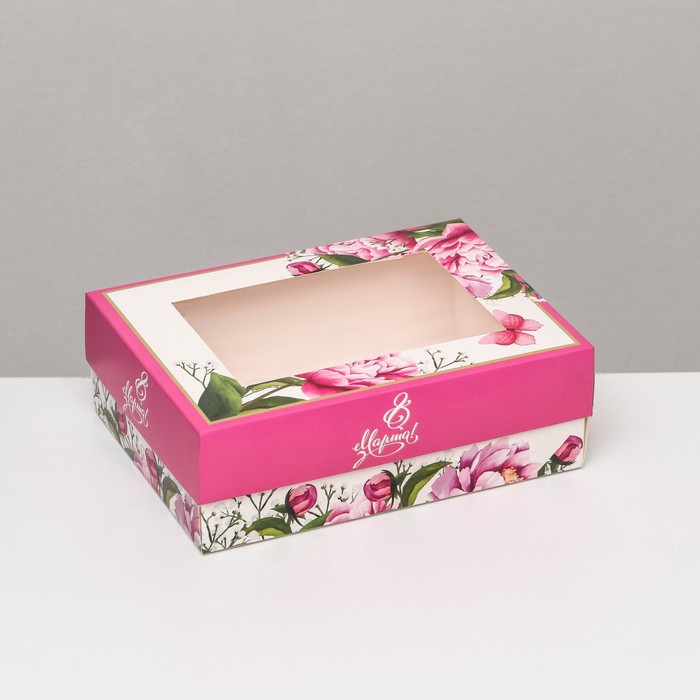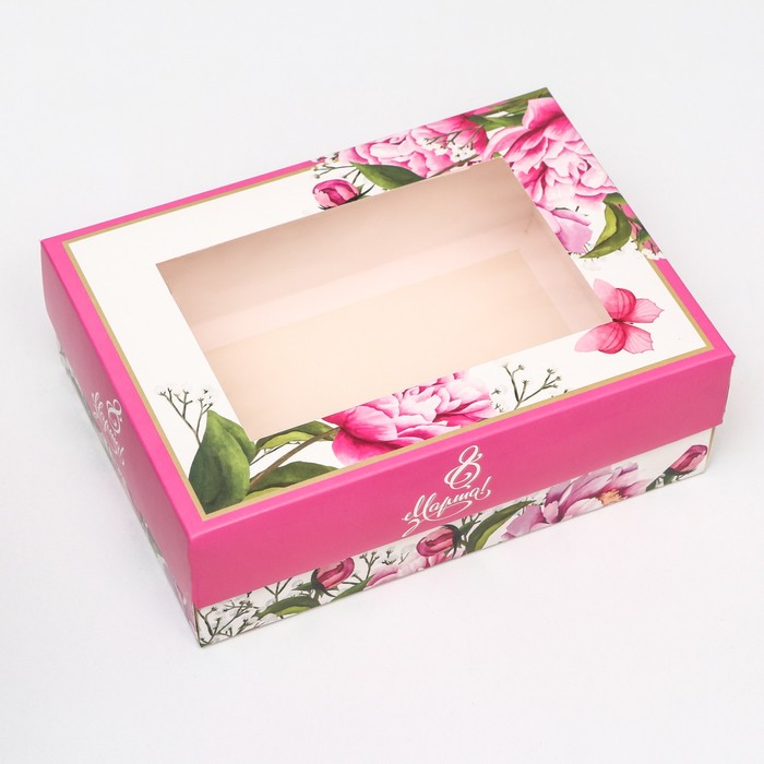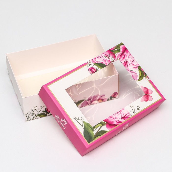 Коробка складная, с окном «Весенние пионы» 21×15×7 см