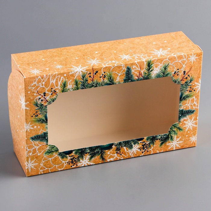 Новогодняя складная коробка с окном размером 25 х 15 х 7 см — это идеальная упаковка для праздничных подарков и угощений. Изготовленная из прочного картона, коробка украшена ярким зимним дизайном с новогодними мотивами, создавая атмосферу праздника.