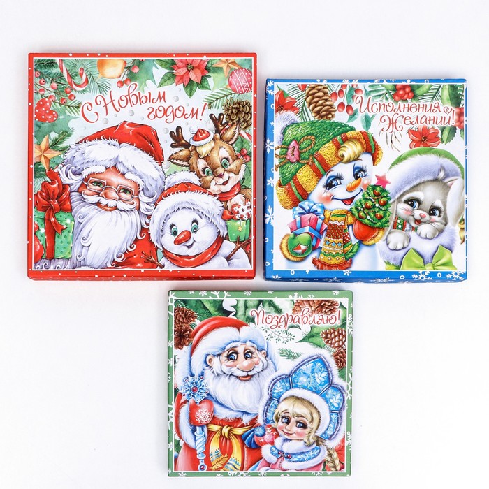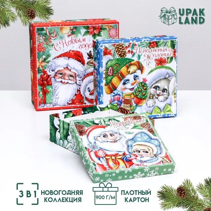 Коробки новогодние подарочные 3 в 1 «Новогодние герои», 19×19×7.5 - 14×14×4 см — Характеристики