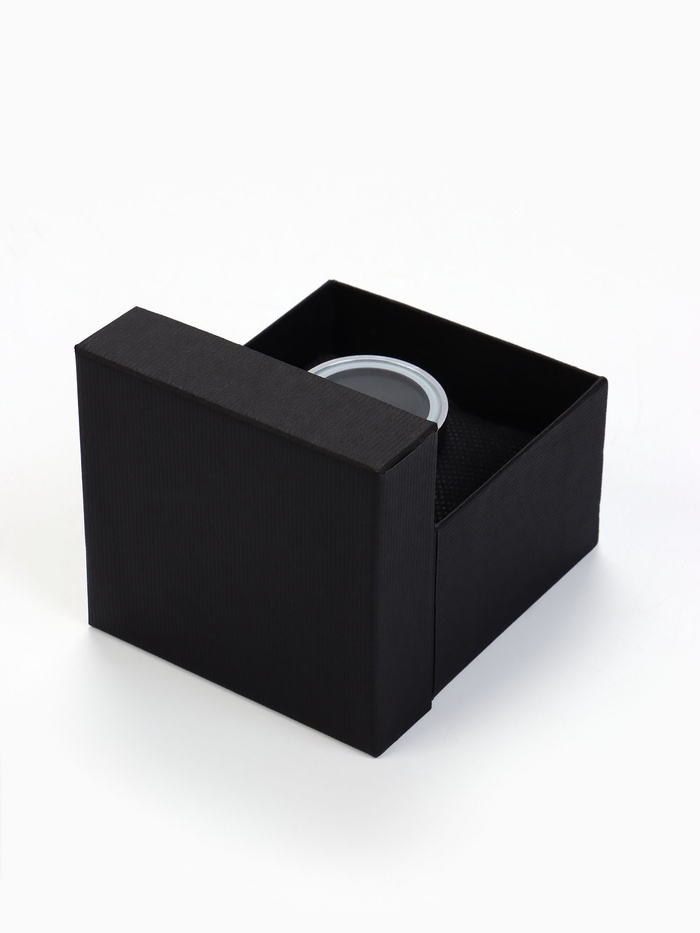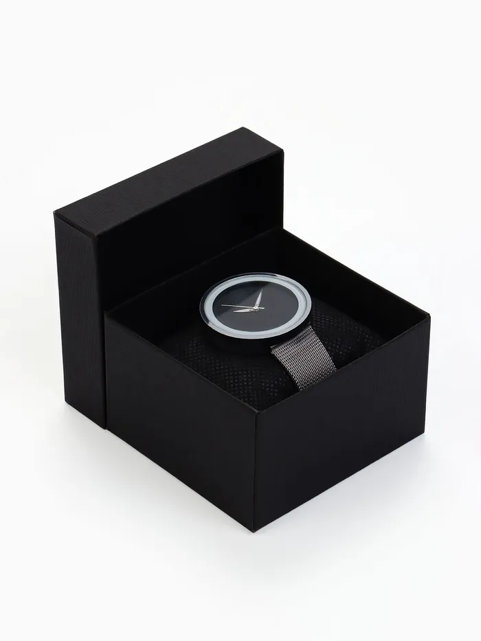 Компактная коробка для часов в чёрном цвете с чёрной вставкой — идеальное решение для хранения и презентации ваших любимых аксессуаров. Размер 9 х 8,5 х 5 см позволяет надёжно разместить часы, сохраняя их в безопасности и подчёркивая статус владельца.