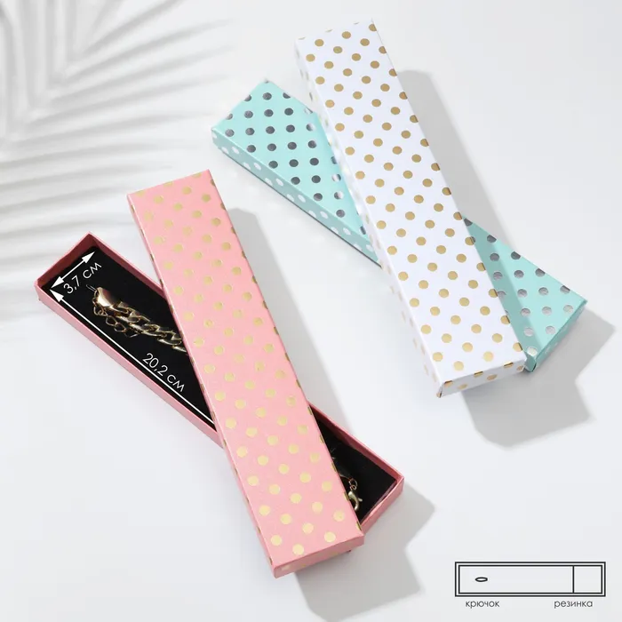 Подарочная коробочка «Горошинки золотые» — это идеальное сочетание элегантности и игривости. Размер 21×4 см идеально подходит для упаковки браслетов, цепочек или часов, а стильный принт с золотыми горошинками на фоне нежных оттенков в цвете МИКС создаёт неповторимый визуальный эффект. Эта коробочка сразу привлекает внимание и добавляет подарку особое очарование.