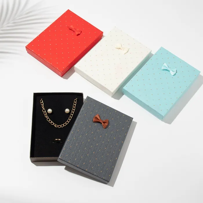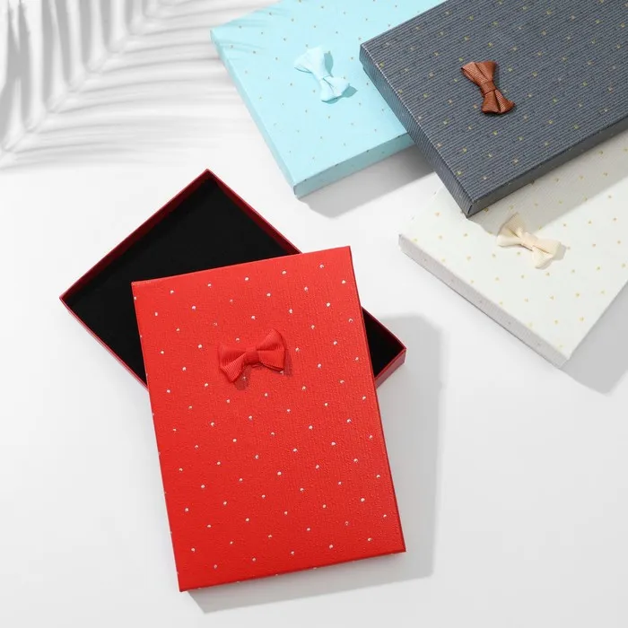 С нашими прекрасными коробочками любой подарок станет еще лучше и ярче. Футляр выполнен из прочного плотного картона. Оптимальный размер коробки 13*18см позволяет разместить разнообразные виды ювелирных изделий – от сережек до колье. Внутри каждой коробочки с крышкой есть чёрная бархатная подложка. С помощью специальных прорезей на подушечке можно аккуратно разместить и зафиксировать цепочки, гвоздики и перстни. А если убрать подложку, упаковка подойдет даже для часов с мягким плоским ремешком или на цепи.
