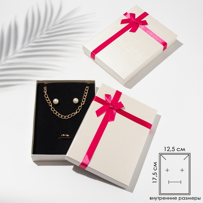 С нашими прекрасными коробочками любой подарок станет еще лучше и ярче. Футляр выполнен из прочного плотного картона. Оптимальный размер коробки 13*18см позволяет разместить разнообразные виды ювелирных изделий – от сережек до колье. Внутри каждой коробочки с крышкой есть чёрная бархатная подложка. С помощью специальных прорезей на подушечке можно аккуратно разместить и зафиксировать цепочки, гвоздики и перстни. А если убрать подложку, упаковка подойдет даже для часов с мягким плоским ремешком или на цепи.