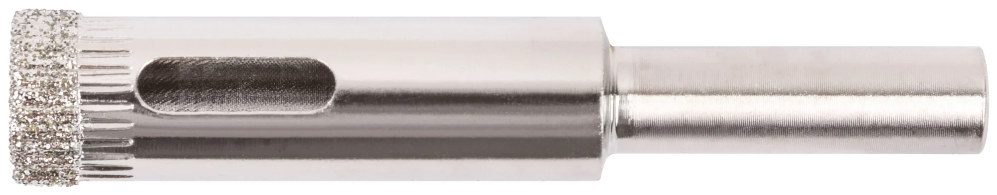 Коронка изготовлена на основе хромированной стали с алмазным напылением на режущих кромках, что обеспечивает высокую производительность и долгий срок службы. Предназначена для влажного сверления, что уменьшает нагрев и износ инструмента.