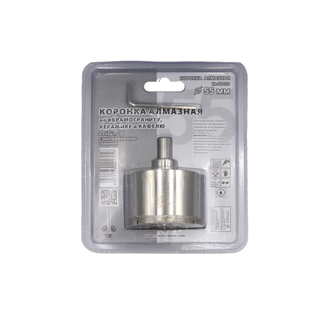 Коронка алмазная от TRIO-DIAMOND диаметром 55 мм идеально подходит для сверления отверстий в керамограните, керамической плитке и стекле. Благодаря центрирующему сверлу в комплекте, вы сможете работать с максимальной точностью даже на самых сложных поверхностях.