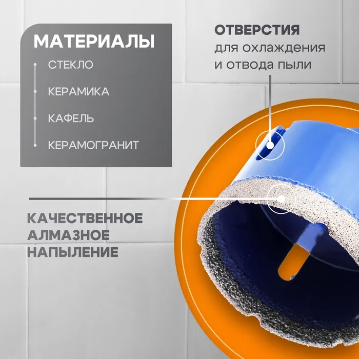 - Чистый и быстрый рез: Алмазное напыление обеспечивает эффективное сверление без сколов и трещин. Диаметр 65 мм отлично подходит для создания отверстий под розетки, выключатели или другие коммуникации в керамике, стекле и других материалах.
