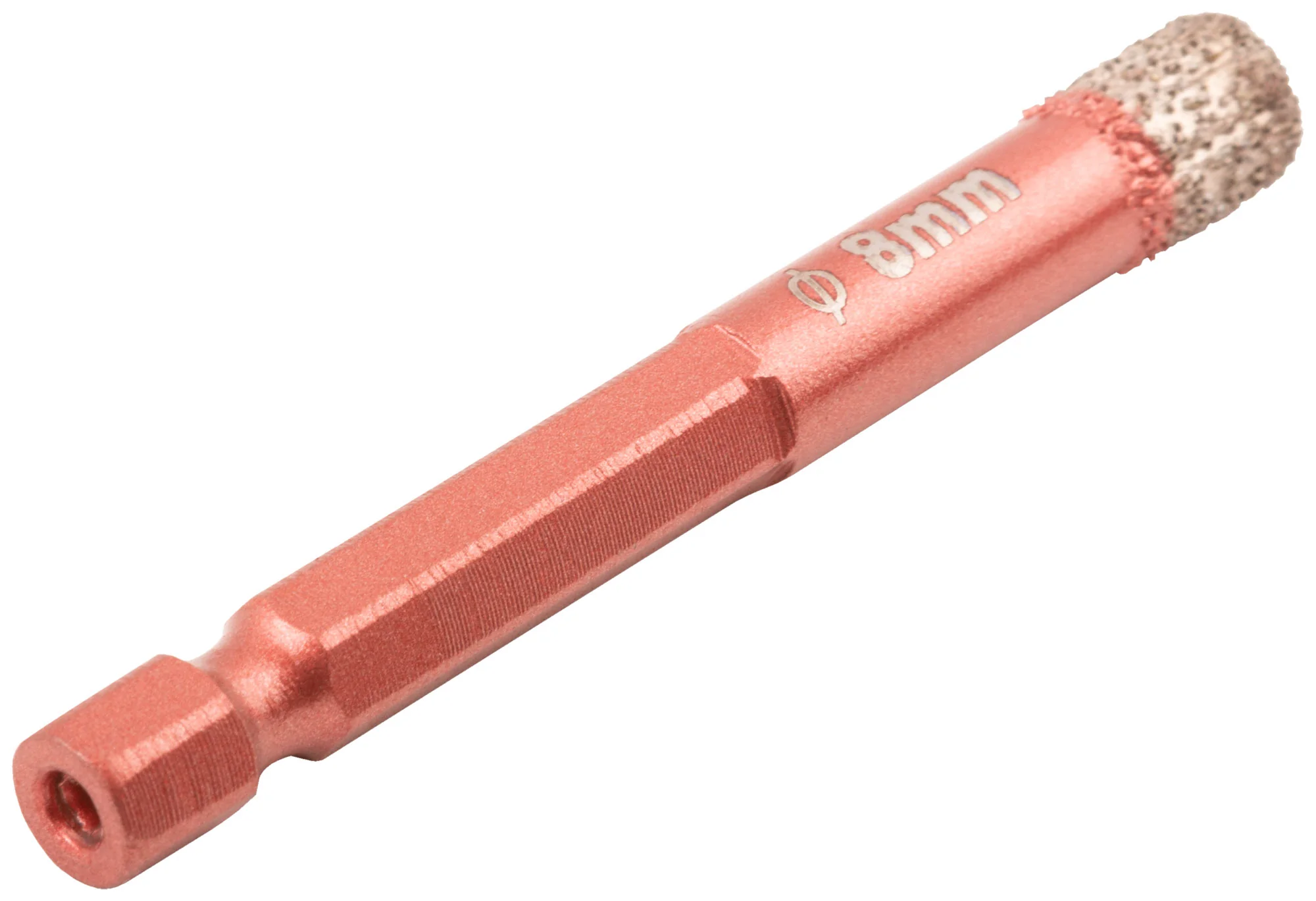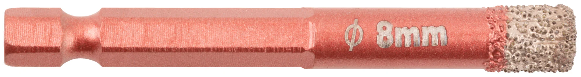 Коронка оснащена шестигранным хвостовиком 1/4'', что обеспечивает надежное крепление и совместимость с большинством стандартных инструментов. Изготовлена из инструментальной стали с использованием технических алмазов, а специальный охлаждающий материал значительно увеличивает ресурс изделия. Производится методом высокотемпературного вакуумного спекания, что гарантирует прочность и долговечность.