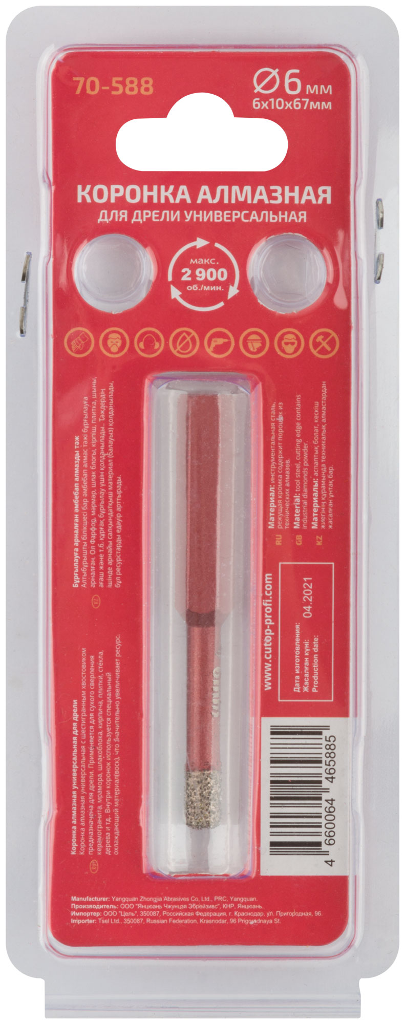 Коронка изготовлена из инструментальной стали с добавлением технических алмазов, что обеспечивает отличную износостойкость. Внутри используется специальный охлаждающий воск, который продлевает срок службы изделия. Шестигранный хвостовик обеспечивает надежную фиксацию в патроне дрели.