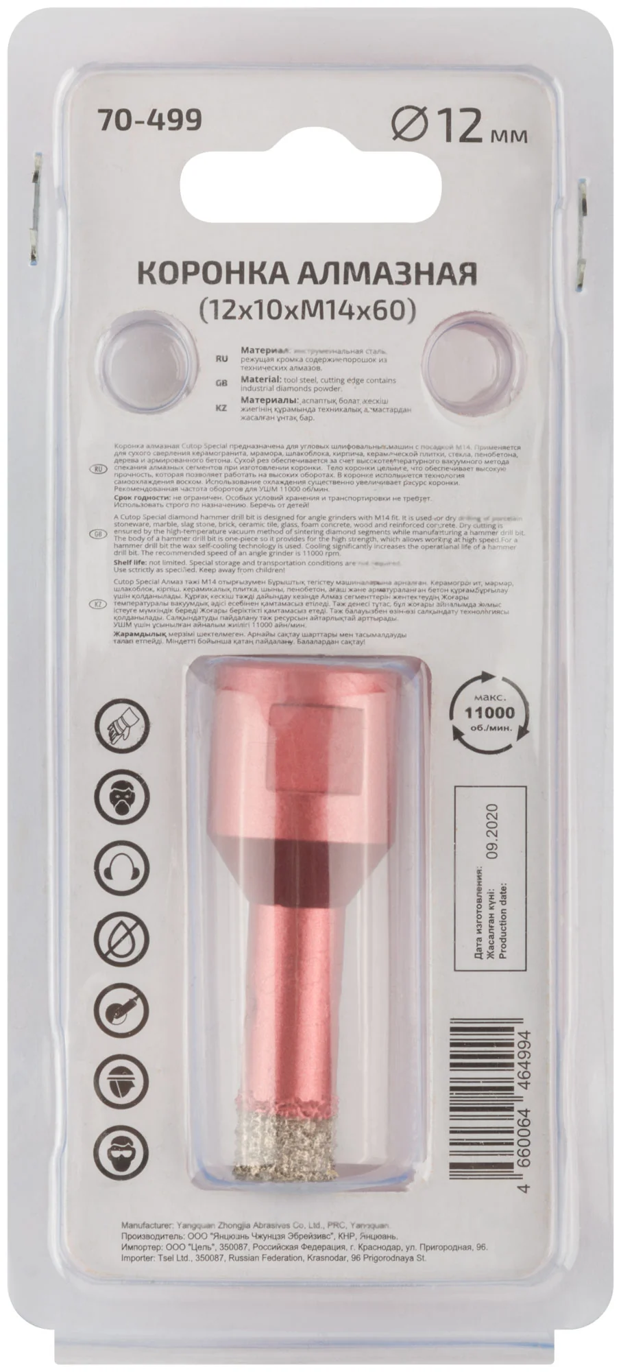 Изготовленная из инструментальной стали с техническими алмазами, коронка обладает высокой прочностью и долговечностью. Ее цельная конструкция обеспечивает стабильную работу на высоких оборотах, а специальный охлаждающий материал внутри коронок диаметром 6-12 мм увеличивает ресурс использования.