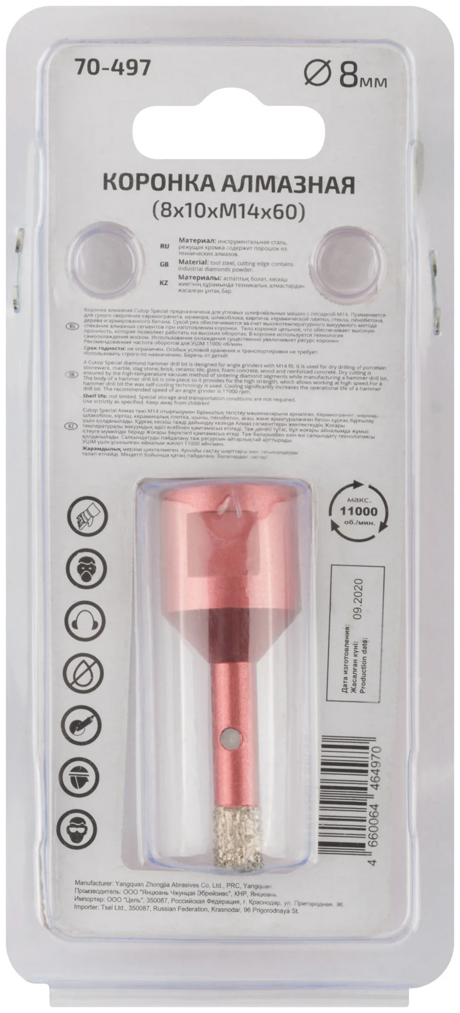 Коронка изготовлена из инструментальной стали с добавлением технических алмазов, что обеспечивает её высокую износостойкость и прочность. Тело коронки цельное, что позволяет использовать её на высоких оборотах, не опасаясь поломки.