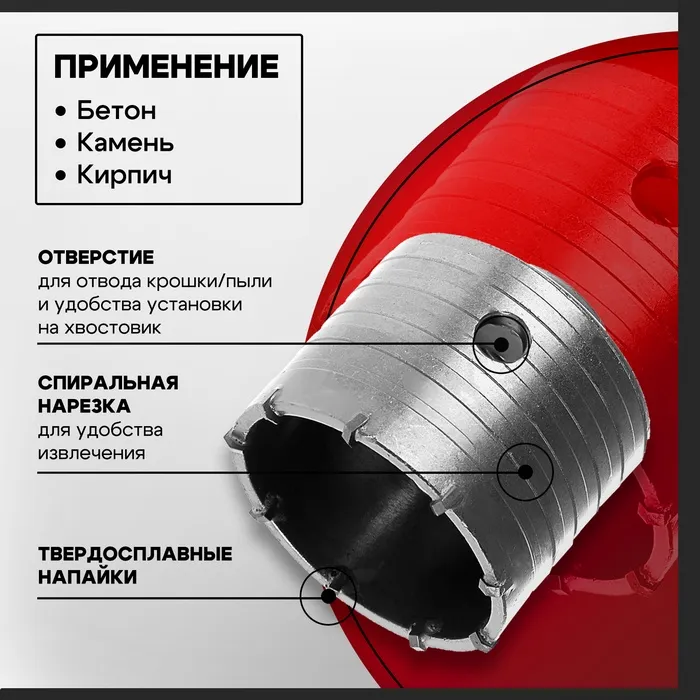 Буровая коронка ТУНДРА предназначена для работы с твёрдыми поверхностями: бетоном, камнем и кирпичом. Модель позволяет бурить отверстия большого диаметра.