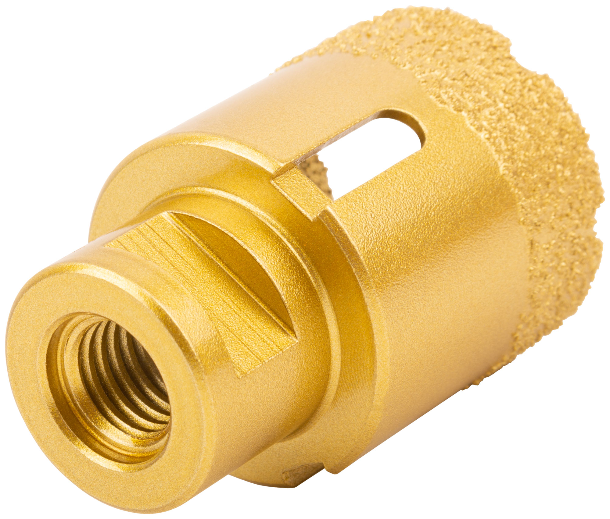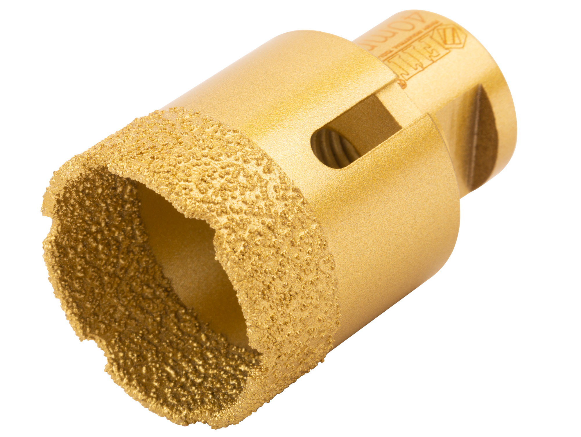 Коронка диаметром 40 мм и длиной 60 мм разработана для углошлифовальных машин с хвостовиком M14. Изготовлена из инструментальной стали с алмазной режущей кромкой, что позволяет использовать ее как для сухого, так и для влажного сверления.