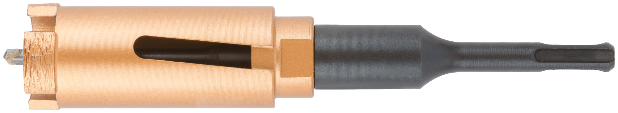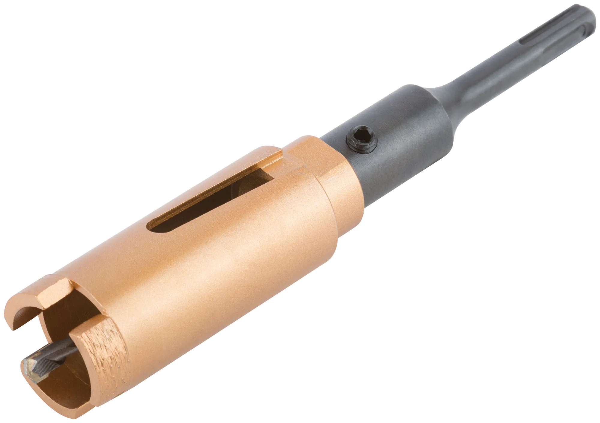 Коронка оснащена центрирующим сверлом и хвостовиком SDS-PLUS, что обеспечивает надежное крепление и удобство в работе. Корпус из инструментальной стали повышает долговечность, а режущая кромка с техническими алмазами гарантирует высокую эффективность.