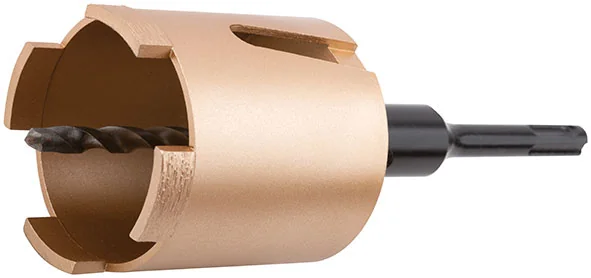 Конструкция коронки включает корпус из инструментальной стали, хвостовик и центрирующее сверло из легированной стали, а режущая кромка обогащена порошком из технических алмазов, что обеспечивает долговечность и высокую производительность.
