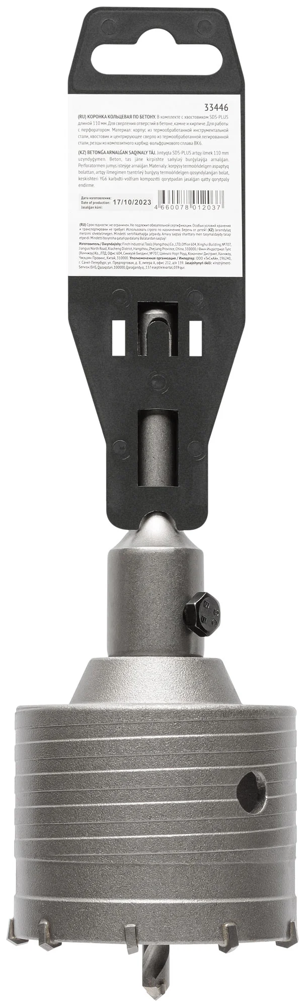 Коронка выполнена из инструментальной стали с хвостовиком и центрирующим сверлом из легированной стали с добавлением хрома. Твердосплавные резцы из карбида вольфрама обеспечивают долговечность и высокую производительность инструмента.