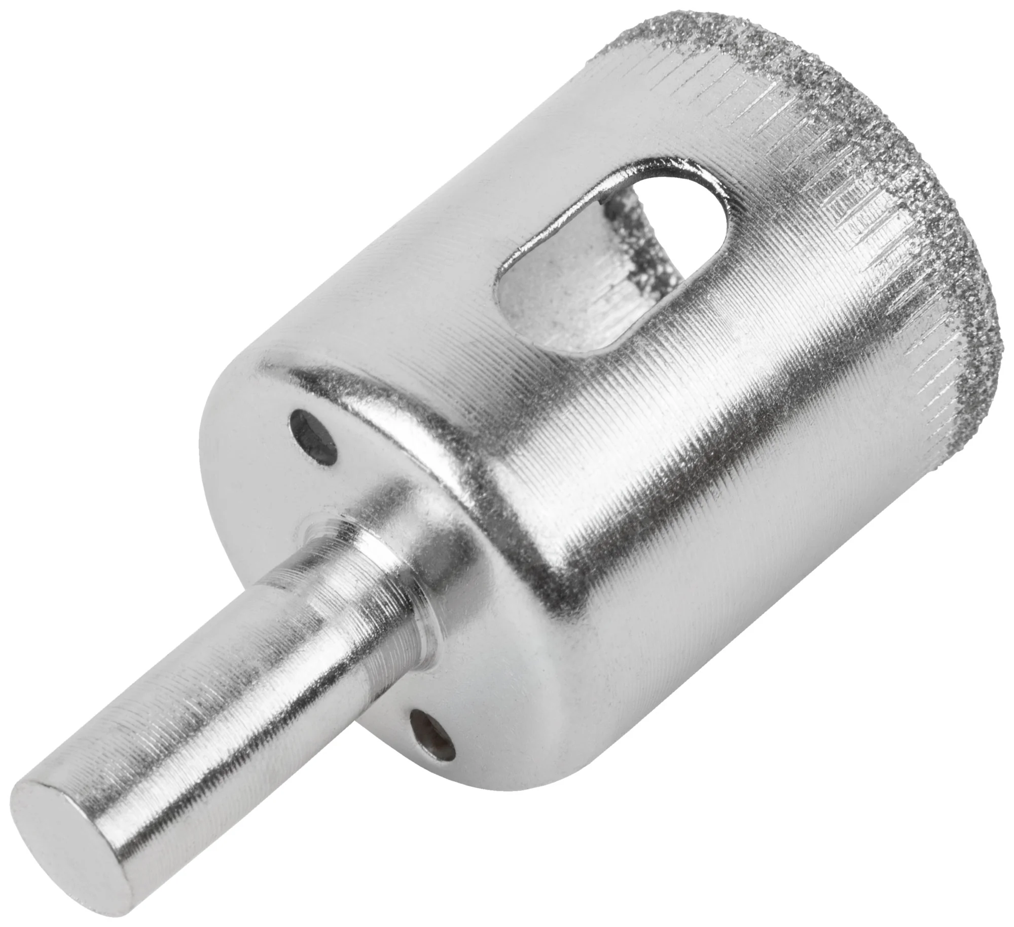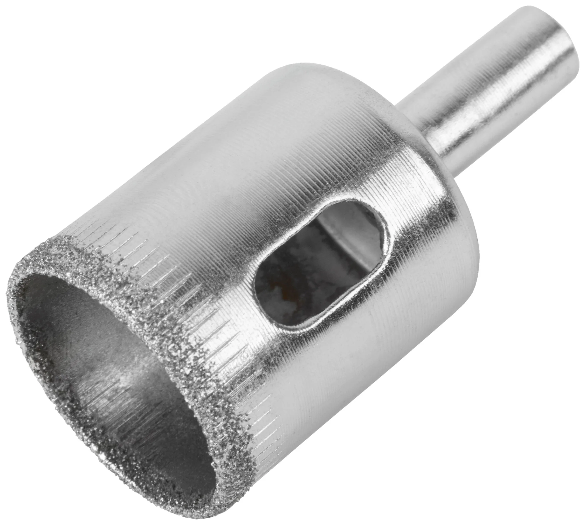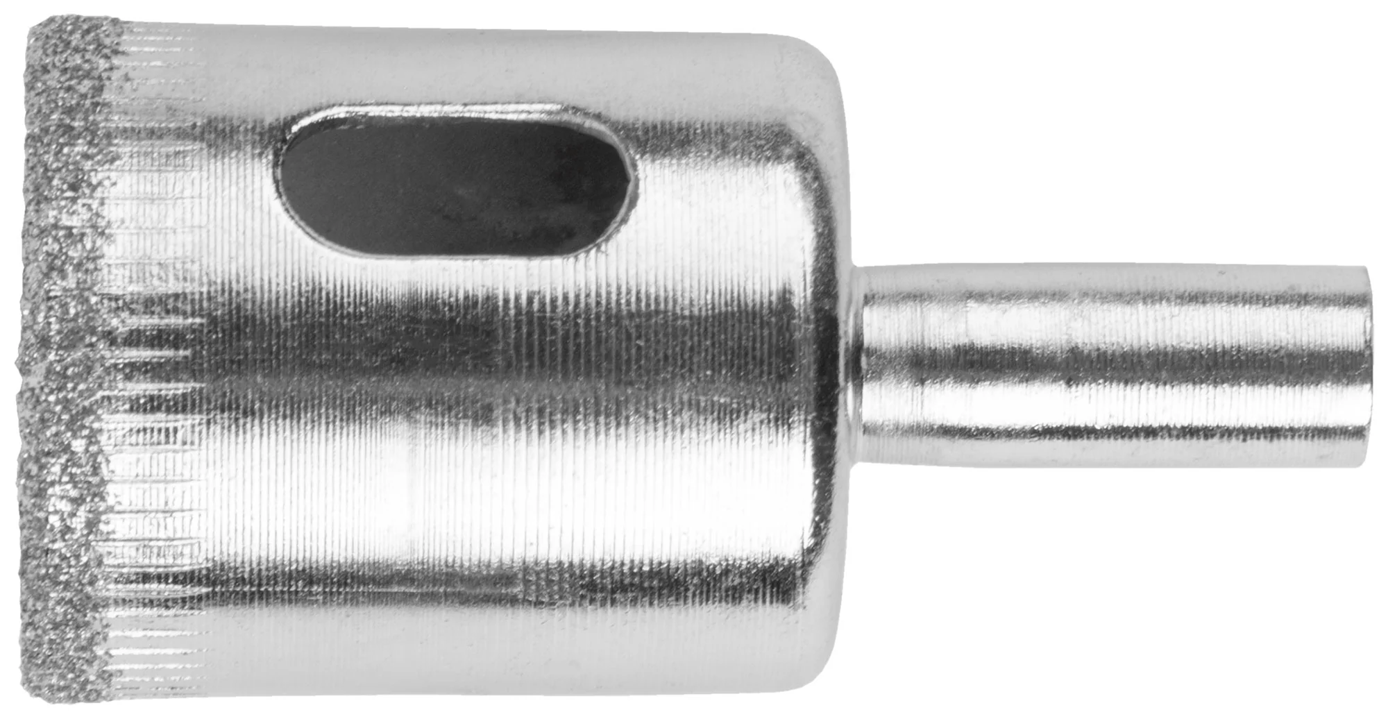 Коронка изготовлена из инструментальной стали с режущей кромкой, содержащей технические алмазы. Она предназначена для влажного сверления, что обеспечивает долговечность и высокую производительность в работе. Цилиндрический хвостовик облегчает установку на большинство стандартных дрелей.