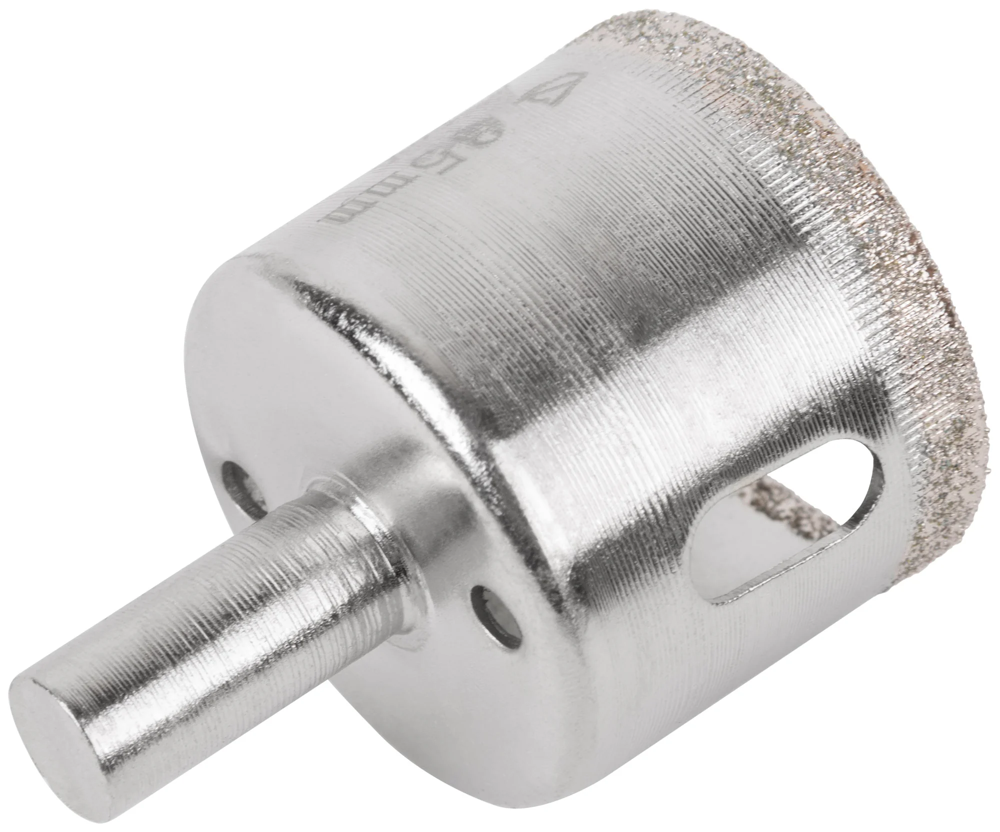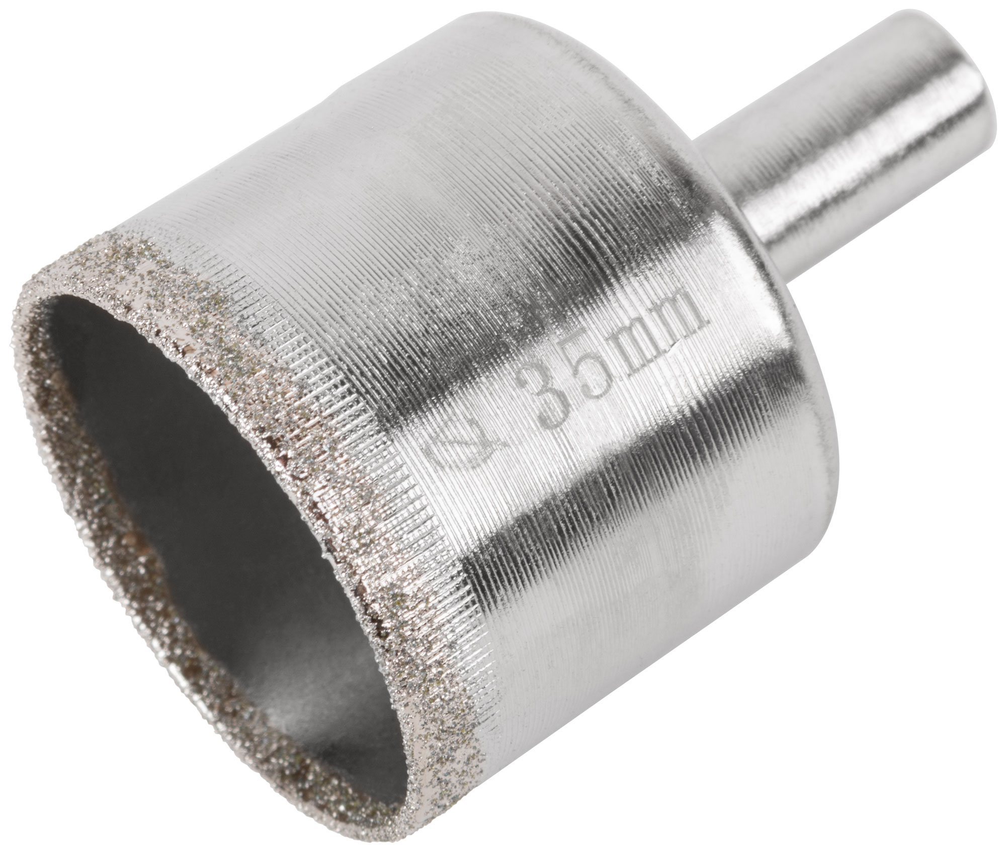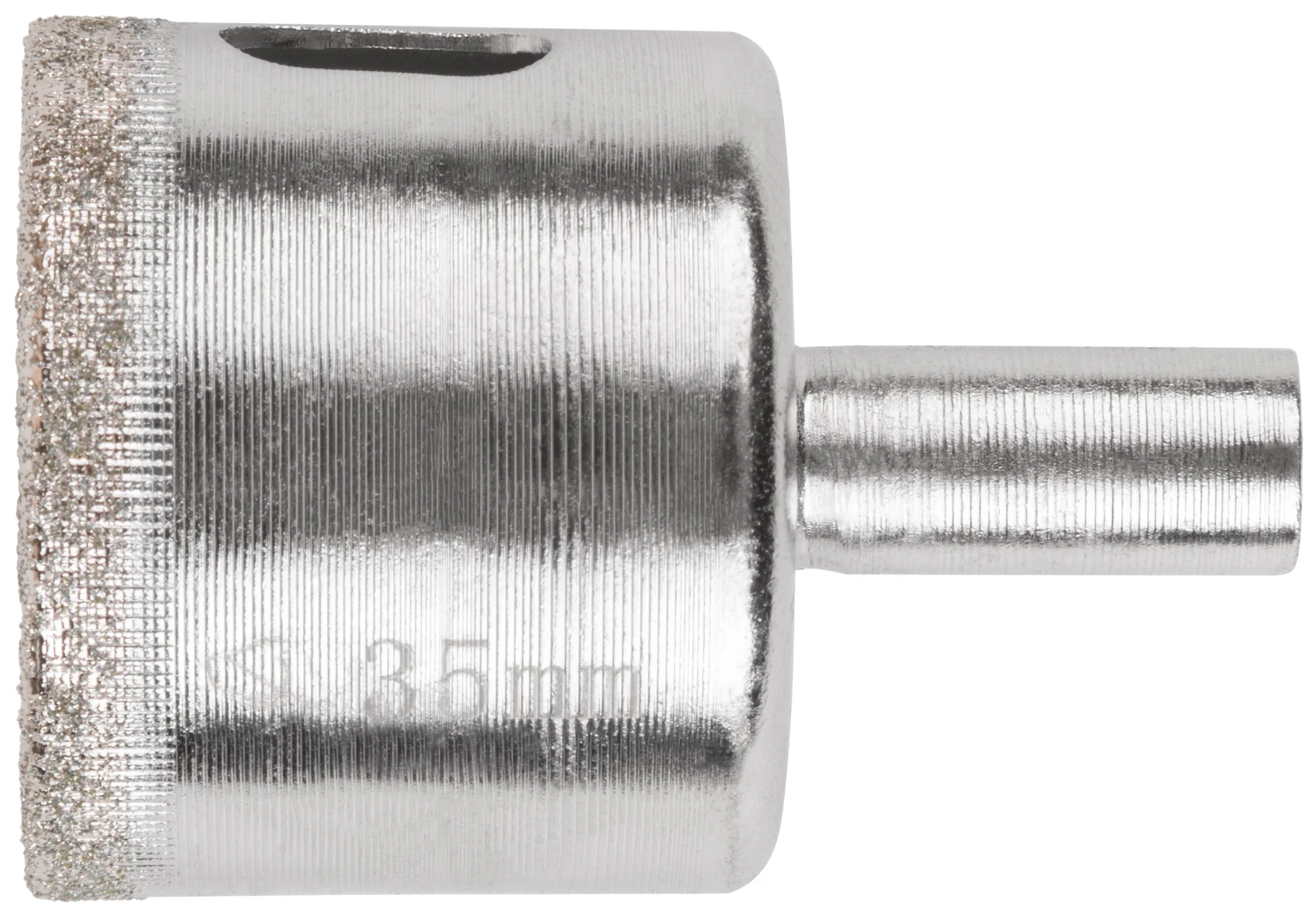 Изделие имеет цилиндрический хвостовик, что обеспечивает надежную фиксацию в дрели. Режущая кромка, содержащая порошок из технических алмазов, позволяет производить влажное сверление, минимизируя риск повреждения материала. Глубина пропила составляет 30 мм, что подходит для большинства стандартных задач.